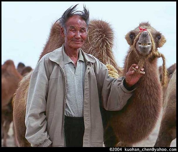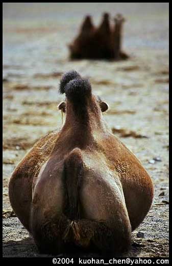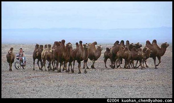 是笑主人吧?駱駝群像是野生的,可以自由活動,不需主人看顧。不會跑掉嗎?馬姆說,他們認得主人。他說,2000年我們牽駱駝一起旅行〈成吉思汗遠征隊〉時,記得嗎?我們買的那隻白駱駝,離了家就哭,走了上百公里後,趁我們不注意偷偷跑掉了。他說,只要一個晚上就可以跑回家。真的那麼會跑嗎?