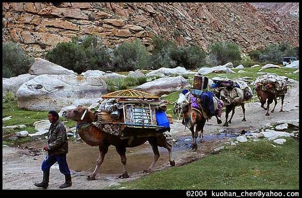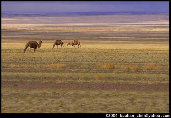 這張是秋天我們將離開山區的時候。蒙古人說:過2天就要下雪了。所以那幾天我們常遇到搬家的駱駝隊。