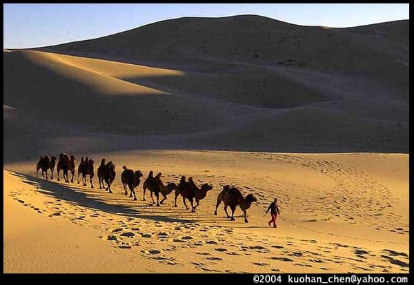 ◆沙漠裡的駱駝隊。想要騎駱駝,可以向牧民借,1小時大概5美金。