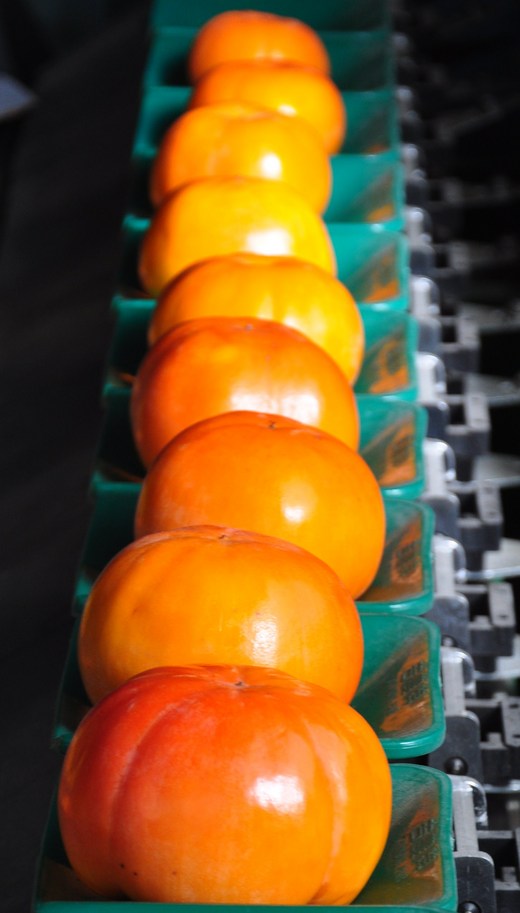 把甜柿 一顆一顆擺在 選果機器上 像是一列長長火車 的 托盤上