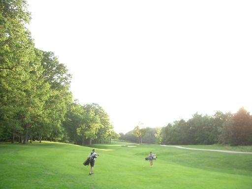 6月14日晚上20:12分,太陽還斜掛在天空,偶走到第16洞梯台(Par 4),往果嶺一看,哇塞!差點嚇歪了,斜陽透過樹梢,亮金金的不偏不移的就剛好照在果嶺上,除了果嶺沒有一處有陽光,偶一輩子都沒碰過這種震憾,拿相橡照因為太遠照不清楚,等開完球快步趕到落球區時,斜陽己跑出果嶺。照不出那種夢幻之美了。
