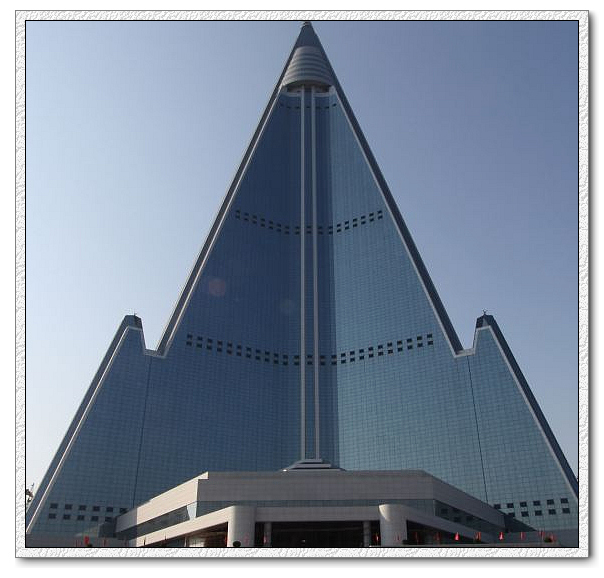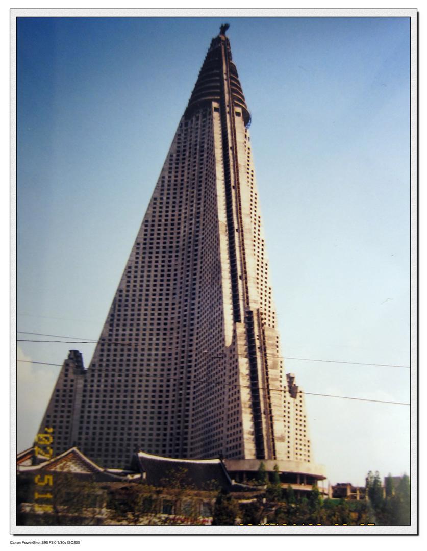 這座三角錐造形的摩天樓出自金日成的構想,他除了要超越首爾在1985年底落成的63金色大樓(63層樓高249公尺,南韓最高建築),還想再多創幾個世界第一的頭銜。平壤有高60公尺的凱旋門,比法國凱旋門高10公尺 ;170公尺高的金日成主體思想塔比華盛頓紀念塔還高出1公尺,是全球最高的碑塔;23公尺高、相當七層樓的金日成銅像則是世界最高大的銅像則是世界最高大的銅像。金正恩要蓋巴黎鐵塔,山寨版肯定比本尊高大。