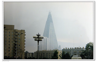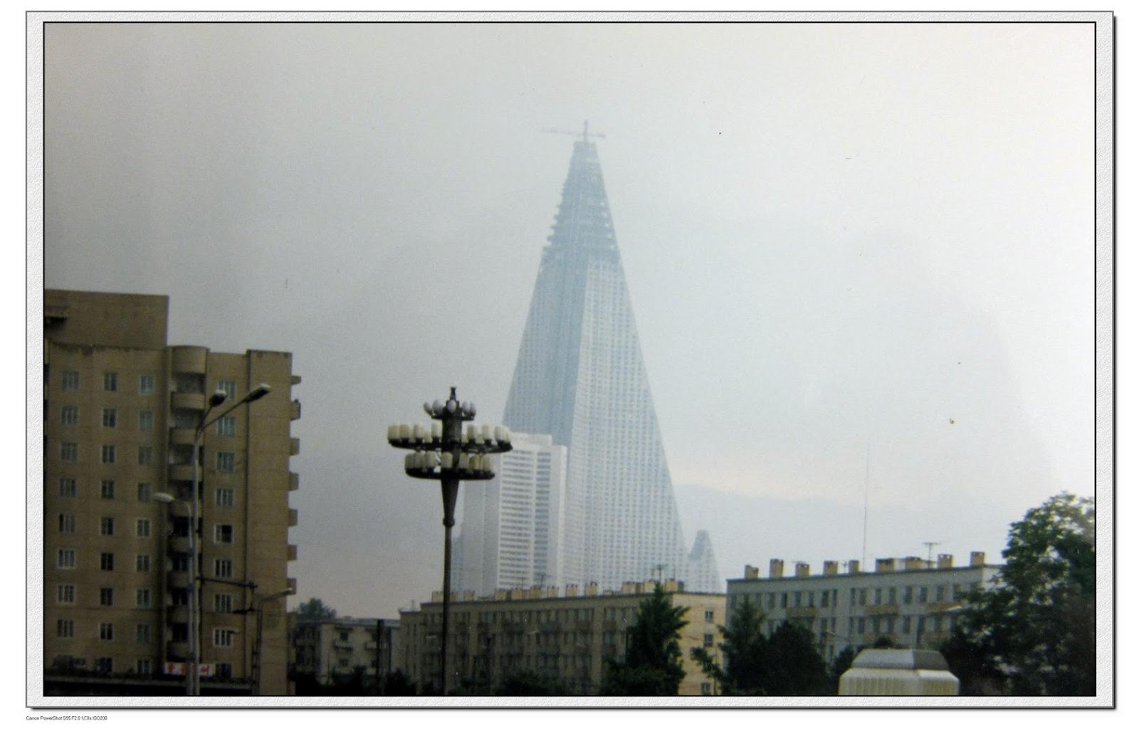 平壤市區有一棟高聳殘破的地標,1997年5月我和前立委張旭成等四人前往平壤,當地安排會說華語的接待全程跟監。當時我想拍攝這棟殘樓,跟監不同意,因此第二天我坐在小巴士後座,趁著跟監不注意時偷拍。這棟灰濛濛的殘樓遠看像座消瘦的金字塔,塔頂還懸掛著一台吊車;近看像密集蜂巢構成的建築物,裸露破舊的窗框像千百個骷髏頭深邃的眼睛,哀怨無助的望著路過人車。