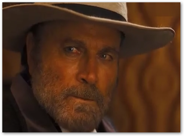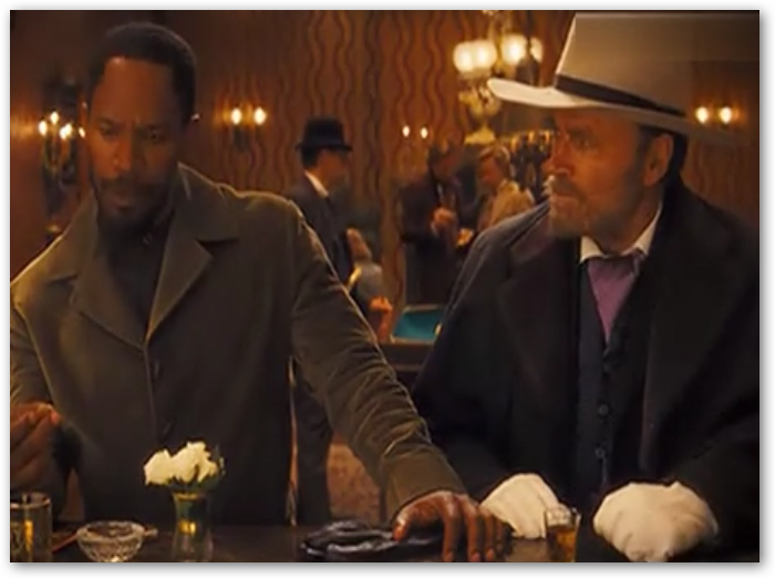 影片推進到一半,李奧納多狄卡皮歐看完一場黑奴生死格鬥之後,鏡頭轉到旁邊觀看助陣的友人走出房間,要女黑傭替他穿戴好外套(居然和《Django》裡的穿著相同),然後走到吧檯正在抽菸的主角傑米福克斯身旁,點了一杯龍舌蘭,接著問他姓名,傑米說:Django;這位陌生人又問他會拚字嗎,傑米一個字一個字念出:D-J-A-N-G-O,緊接著說:D unsounded( D不發音),這時陌生人的臉部特寫鏡頭出現,原來他就是46年前《Django》的本尊法蘭哥尼羅,對我們這些從小看電影長大的影迷來說,這畫面太震撼了(這一幕片段出現在預告片裡)。法蘭哥尼羅演出《Django》時才25歲,今年已經72歲,看起來只有60歲左右,臉上沒有太多歲月的風霜;看到這位大鏢客我才想起來片頭的音樂原來就是貫穿《Django》全片的主題歌,黑白兩代Django隔了半世紀被戲劇性的安排在一起,年輕一代或沒看過《Django》的觀眾對這幕一分多鐘的鏡頭覺得莫名其妙,頂多認為主角告訴我們Django的正確發音而已。