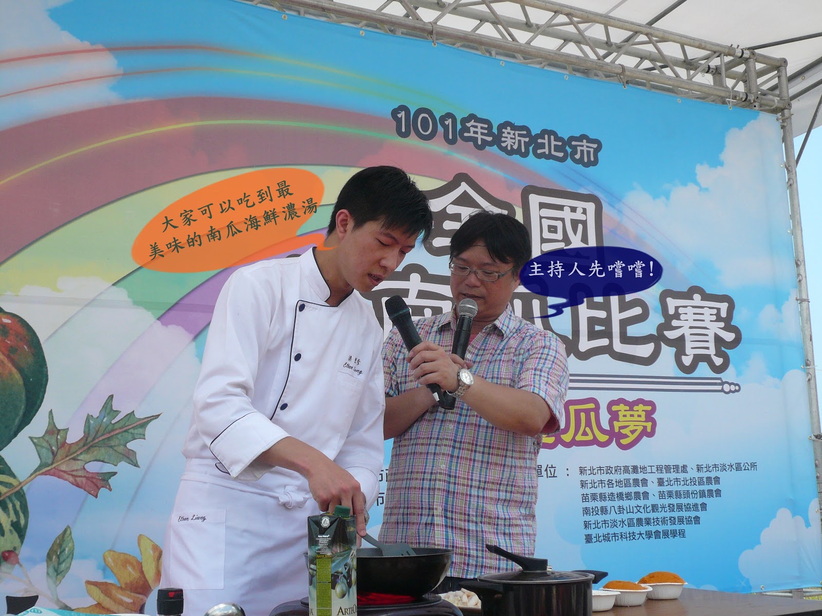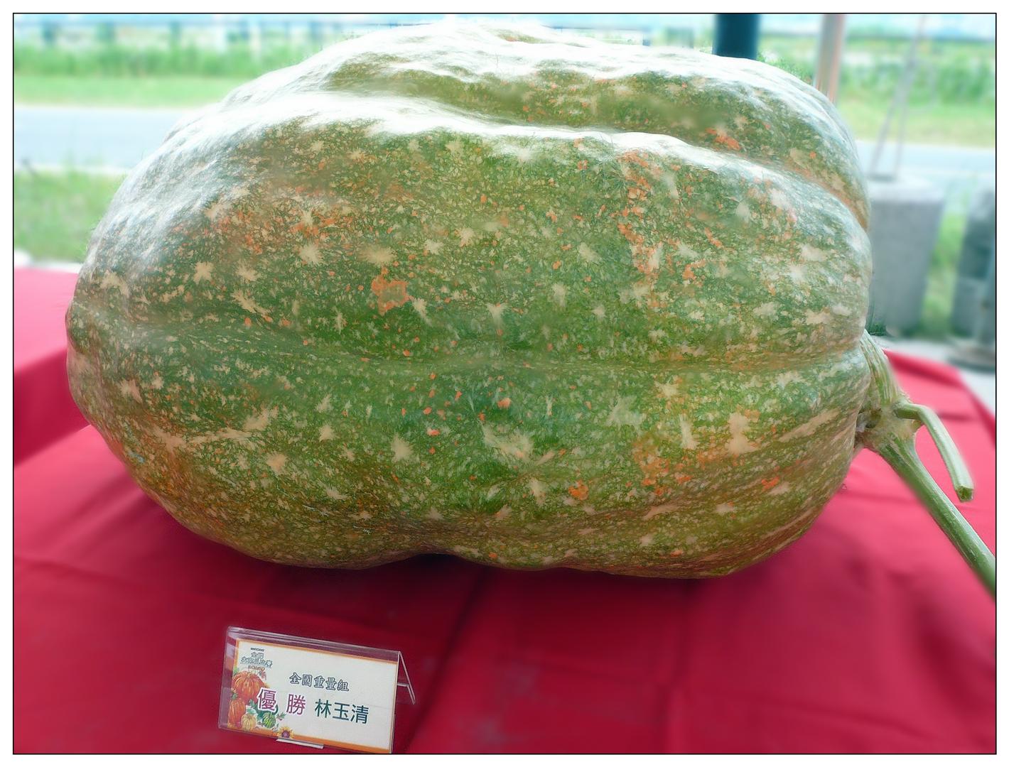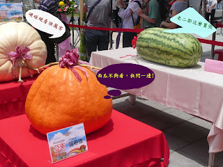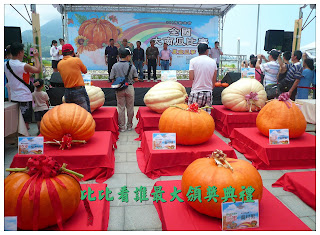 接著又到捷運站正後方廣場看"全國南瓜大賽",苗栗縣農民徐滄浩197公斤的大南瓜獲得冠軍;新北市淡水區瓜農林建訓的192公斤南瓜居次。金氏世界紀錄中「最大的南瓜」重達821公斤,來自美國威斯康辛州的農場,不知是吃什麼肥料才能長得這麼巨無霸。台北圓山飯店年輕瀟灑的名廚現場煮出一鍋南瓜海鮮濃湯,搭配主辦單位提供豐盛的南瓜點心,讓現場觀眾爭先恐後,一飽口福。