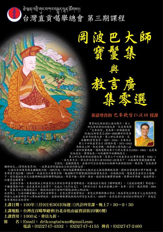 直貢噶舉總會 恭請黃英傑博士(尊貴的 巴麥欽哲 仁波切) 於三月9日起講授『岡波巴大師 寶鬘集 與 教言廣集零選』