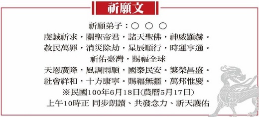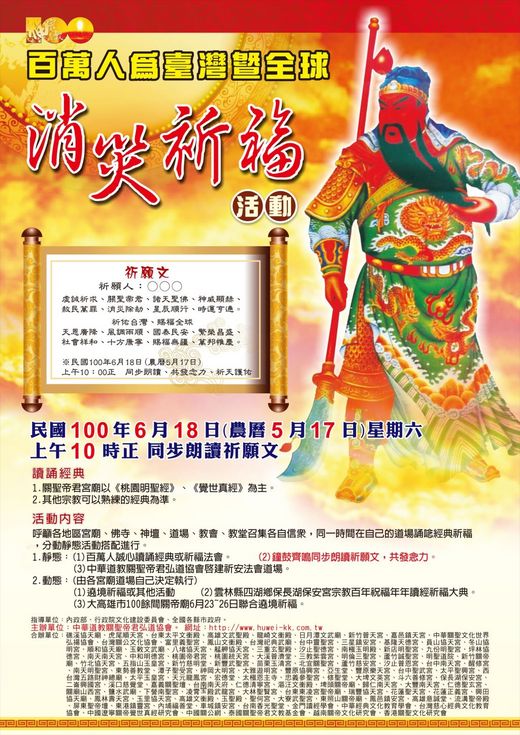 建國100年恰逢辛卯兔年,在慶祝國家百年生日的同時,全球卻天災人禍不斷傳出,幸蒙天佑台灣福地,開春迄今台灣未有重大災情發生。「辛卯年百萬人為台灣暨全球祈福活動」發起人暨台灣關公文化協會理事長吳金德提醒民眾,面對即將到來的下半年度,不論是颱風、地震以致其他天災人禍的威脅,大家還是不能掉以輕心,並且邀請所有民眾在6月18日(星期六),透過實體活動、網路活動的參與,以同體大悲的心情為全球百姓一起祈福。 吳金德表示,今年世界各國的消災祈福活動,不論是由政府或民間所發起,再再都吸引無數民眾的參與投入,顯見人類開始認真看待自己的渺小而回過頭來與老天爺對話,面對許多無能為力的災害發生,除了人們必須反身自省所有的具體作為,集合眾人的念力,對老天爺祈求眾生百姓的平安、健康,更是不可忽視的一股力量。