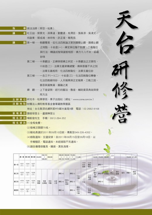 2011年10月1-10日,三梯次天台研修營,全程免費─早晚課法華三昧懺、白天研討會、晚間止觀禪修