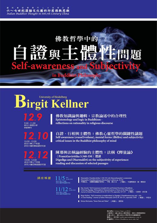 2011/11/12日(六)14:00-18:00 PM 政治大學山下校區研究大樓哲學基礎研究室Dan Arnold, “Self-Awareness (svasaṃvitti) and Related Doctrines of Buddhists Following Dignāga: Philosophical Characterizations of Some of the Main Issues,” Journal of Indian Philosophy (2010) 38: 323-378, especially 347-357. (汪純瑩、胡志強導讀)Birgit Kellner, “Self-Awareness (svasaṃvedana) in Dignāga’s Pramāṇasamuccaya and --vṛtti: A Close Reading,” Journal of Indian Philosophy (2010) 38: 203-231, especially pp. 220ff. (林恕安導讀)Shinya Moriyama, “Sense Data and Ākāra” (張陌耘導讀)