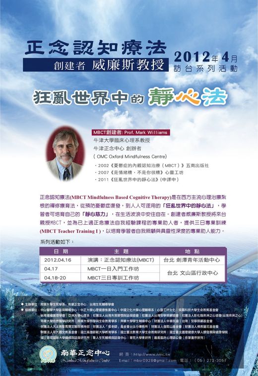 下一則: ~狂亂世界中的靜心法 ~ 正念認知療法 創建者 威廉斯教授 2012年4月訪台系列活動 報名注意事項