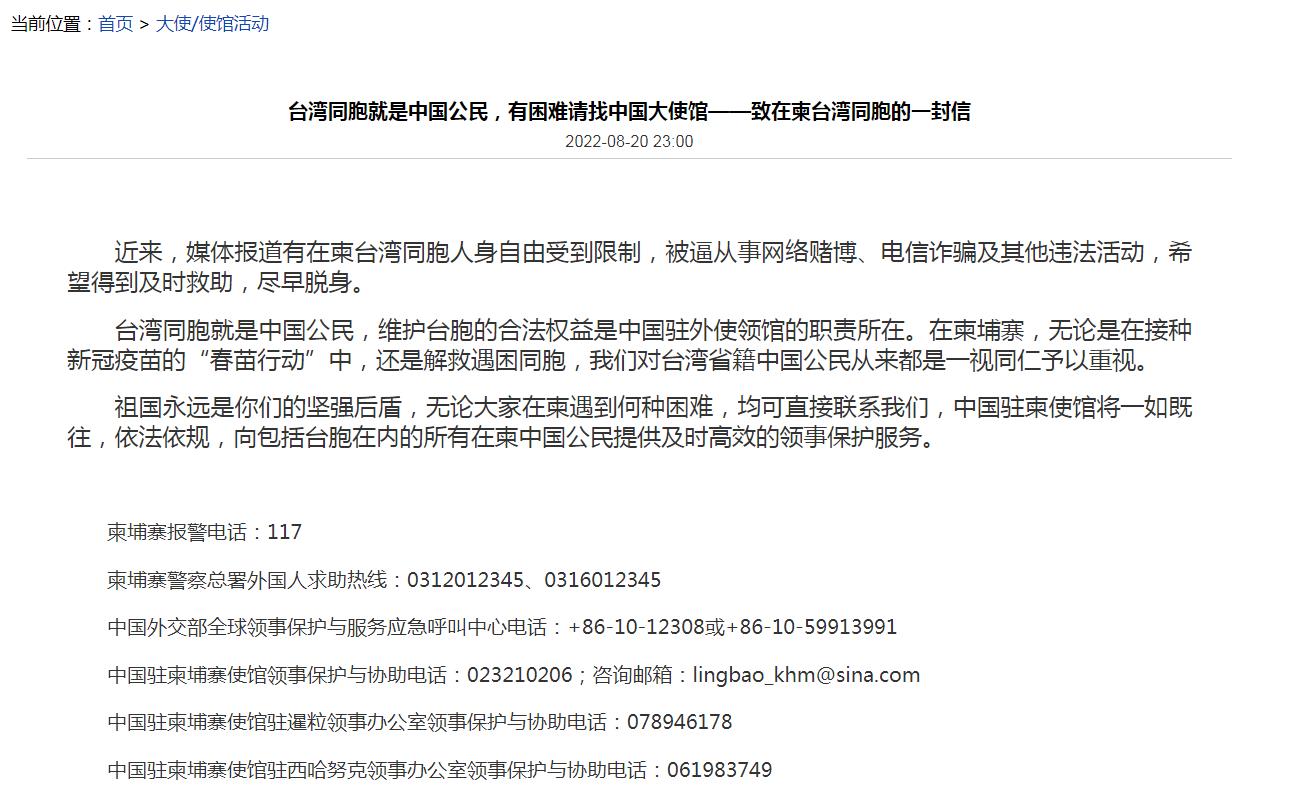 陸駐柬埔寨大使館致信台灣人:有事請找我們