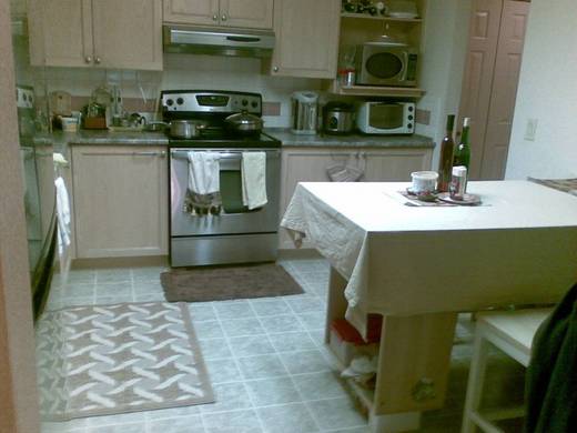 這裡的廚房,面積有4x3.5平方公尺,除了容納500公升冰箱、流理台、洗碗機、大小烤箱、四口爐具、微波盧、吊櫃、外加一個大碗櫃,以及將近1.5公尺寬的作業通道之外,還可以再擺一張餐桌。我喜歡在廚房擺一張方便桌,這樣可以讓兩個以上家人在廚房裡一邊做菜,一邊打雜、再一邊閒聊,偶爾品評剛上桌的美食。此外,比較簡便的餐食,例如早餐,也可以就近在方便桌用餐,用完了各自把餐具放進洗碗機,方便而愉快。前任的屋主就在廚房擺個咖啡桌椅組,這實在太小氣了,也不好用。我喜歡中島型的桌子,搭配高腳椅,這樣我坐椅的時候,就不用彎腰,只需走到高腳椅前,輕輕一蹬,屁股就滑進椅面,把膝蓋輕輕一彎,就把腳板放在椅腳的橫桿上,然後雙手自然放下,剛好擺在高高的桌面,極合乎人體工學的桌椅設計。