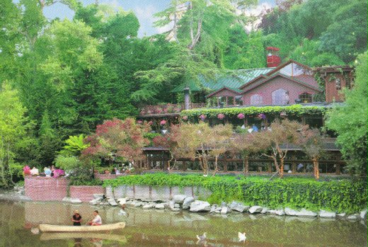 由 San Jose 出發開在彎彎曲曲 Hwy 9 公路約莫 45 分种抵達,在大 Parking lot 把車停好,首先搭一個小紅色 cable car 由地面往山谷下斜吊五分鐘光景到谷底至此餐館,朋友的興奮此時早己全寫在她們的臉上。若沒訂位這個餐館那是根本進不去的,而且該店還俏到一定要全部客人到齊才肯帶位入座,(年青力壯的跑先到,老太太慢慢走過來是行不通的)也許那天是禮拜五晚上,雖然守了以上之規矩還是强迫在酒吧室聽歌手自彈自唱了半小時才搞定坐在滿室小灯隔窗見河堤的上好桌旁。