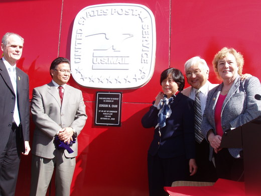 就是因為 Gordon 幫助過太多人,特別是一些對華人好的政客,在他去世八年後的今天一位叫 Mike Honda 的加州眾議員興起在加州議會表揚 Gordon 的提議,昨天在演講中Honda 提到如何為命名 Gordon 郵局這事走遊國會,他最後終於得到加州所有六十多位眾議員的一致同意才能把這天大的榮耀帶給 Gordon 的家人及華僑後代。