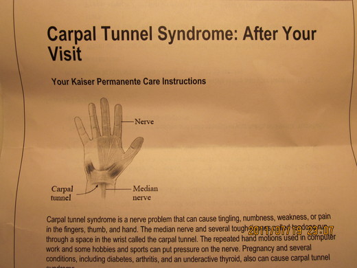 第二個關於手指發麻的答案是打電腦太多之故, 傷了中間的三跟手指頭筋, 該毛病英文叫 Carpal Tunnel Syndrome. Dr. Deft 還說嚴重時可戴手腕套強迫自己少抓"Mouse"老鼠, 回到家我立刻詳讀醫生給我如何做手指運動的單張, 當然說穿了最重要的是自己要節食上網.