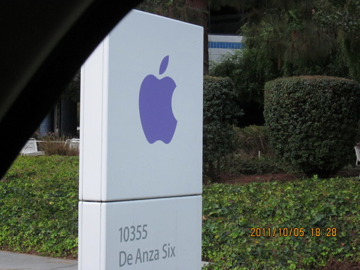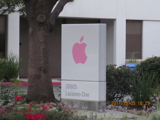 另外今天還有一事也令我們 Cupertino 居民特別傷心, 此乃本鎮的頭號大員外世界網路巨劈蘋果電腦創始人Steve Jobs 病逝, 這位才五十六歲的奇人死於 cancer 王中之王的胰臟癌, 網路上還說這與沈殿霞及聲樂家帕帕拉奇同病, 因為芭姐住家離蘋果總公司不遠特別開車在公司附近轉一圈拍下諸多彩色蘋果的招牌一是哀悼 Jobs 先生二是讓讀者收到現場最新消息.