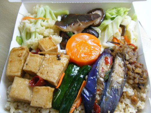 現代人講究健康,在保健室的宣導下,地餐每日中午推出了蔬菜便當,一個50元,這個姑娘喜歡,第一,因為是糙米飯,姑娘愛吃的飯;第二,便當中很多蔬菜姑娘是從來不夾的,因為「體重」都過重(學校自助餐是秤重量的…),之前的室友都稱姑娘的手是電子秤,因為姑娘明明夾滿滿一盒的菜,結帳絕對不會超過五十元,她們夾的看起來也不多,但有時往往高達六、七十元,害她們一度以為阿姨亂算…哈哈~~!姑娘會下廚,知道那些食材或料理是「重量級」的,如絲瓜、花椰菜、百頁豆腐、蒸蛋等,是「重扣扣」的,盡量不夾;那些食材較貴,姑娘也略為知道…,嗯~~!老闆要賺姑娘的錢,不太容易…