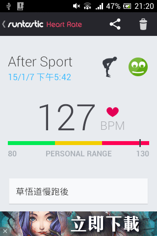 3. 跑步已經進步到不需要休息,平均速度也增加到8km/hr,隔天腿也不會酸。