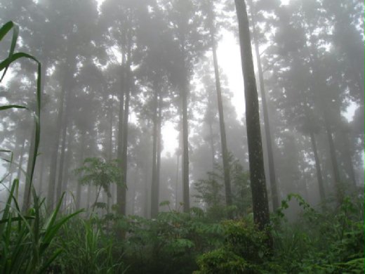 剛開始大夥氣喘噓噓的走了約500公尺頗有坡度的產業道路,路面持續爬升,無緩坡可稍喘息,但路況並不算難走.沿途雖無遮蔭,或因天氣陰涼,暨使走得出汗也不覺炎熱. 路兩旁植生許多新鮮劍竹筍,但豎立著不准採摘的警語. 產業道路的盡頭緊接著的就是登山小徑,之後越走霧氣越濃,吉野杉林內時有小雨飄落,路面濕滑泥寧難行.一大群人迤邐走在霧茫茫的原生密林中,前後呼應著,但林中除迷霧遍佈外,視野全無. 此吉野杉林中的景相與東眼山的柳杉林相頗為類似,但山路較東眼山陰濕陡峭.