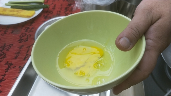 5. 將混攪蛋液(微攪兩三下,勿打勻)以順時鐘畫圈式倒入鍋中,在豪邁從高處灑落細緻蔥花;同時輕輕搖晃平底鍋,看自己喜歡的蛋的熟度決定起鍋時間最後以滑移方式將煮好的料放在白飯上覆蓋。