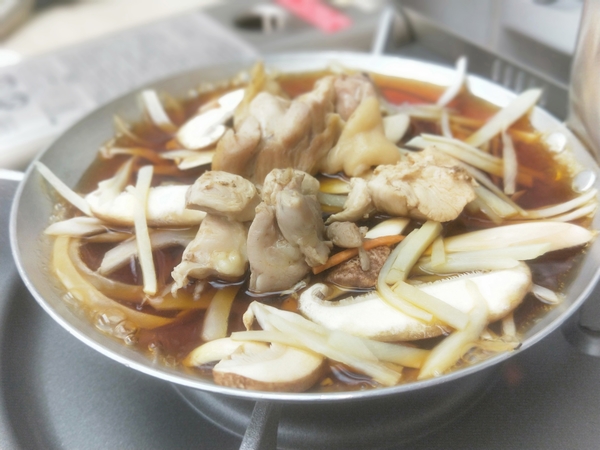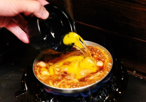 4. 續放香菇切片續炒均勻;倒入親子丼特調醬汁(約90cc),轉中小火煮熟。