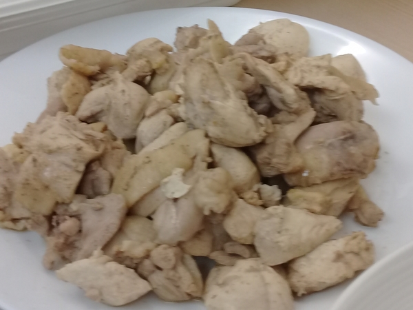 1. 到超市買去骨雞腿肉,斷筋後切成一口大小塊狀,放入滾煮的沸水川燙(去血水)