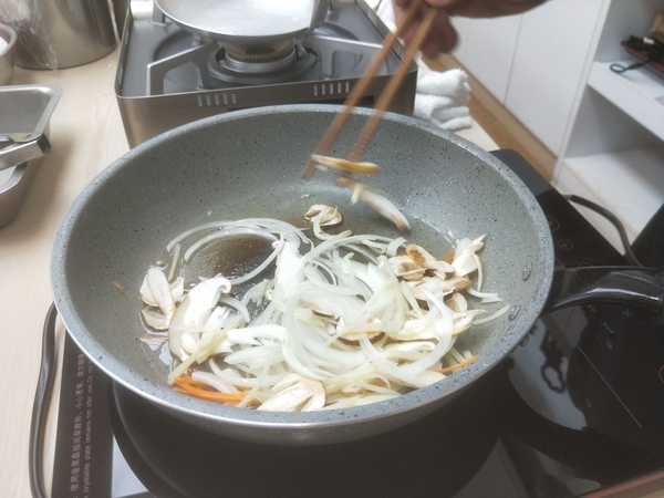 2. 將洋蔥、胡蘿蔔切絲;鮮香菇切片泡到水裡備用。