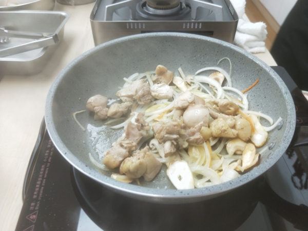 3. 取手鍋(市價約700 ,沒有用小平底鍋子替代 ) ,.下些許油~先拌炒洋蔥絲、胡蘿蔔絲與蔥花白後,下雞塊微煎。