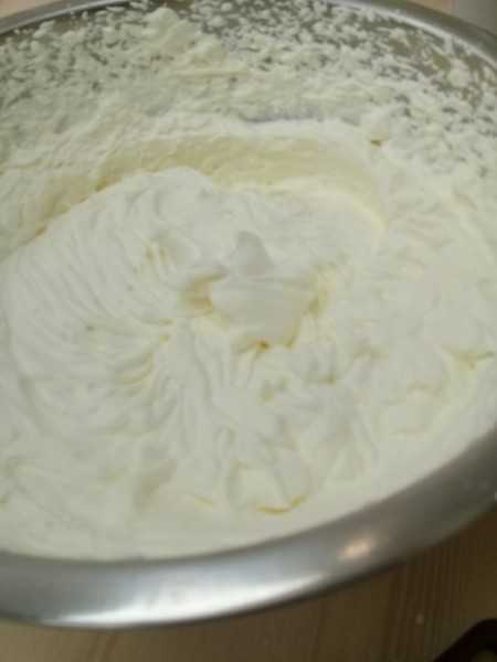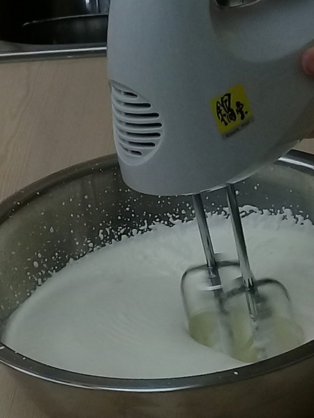 ⑬淡奶油中加入細砂糖,打發硬挺。