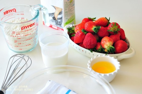 ⑪將新鮮草莓洗凈去蒂,對半切開後,其中一半再對半切開。