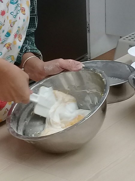 ④取1/3蛋白霜加入到蛋黃糊中,翻拌均勻。