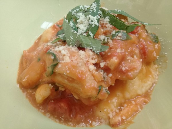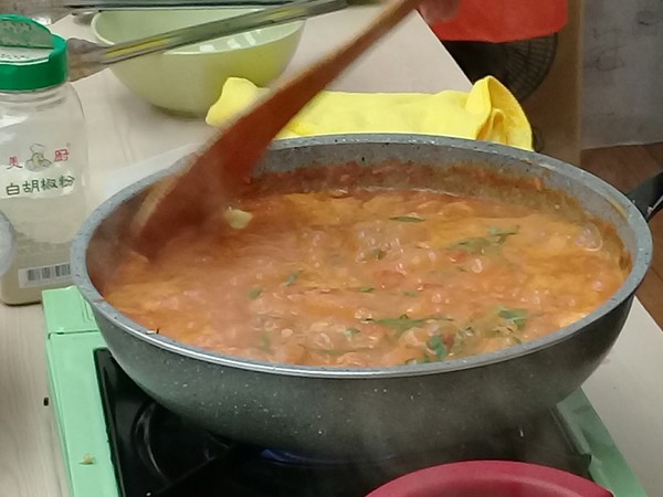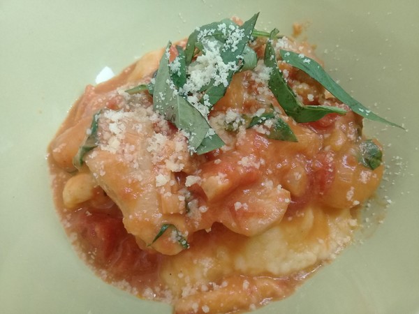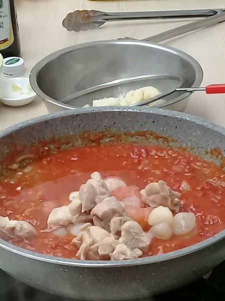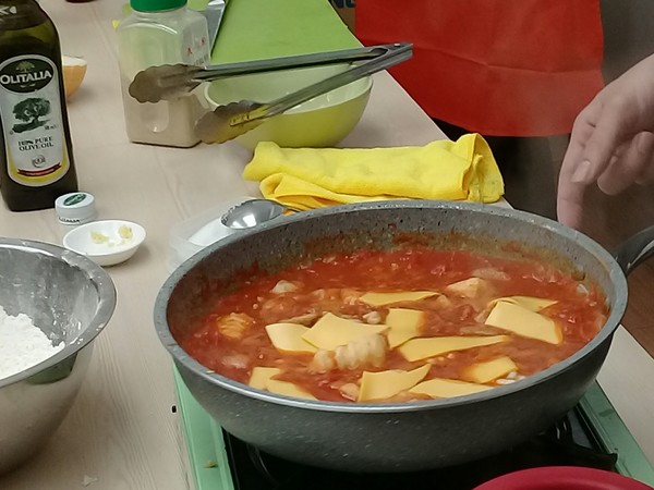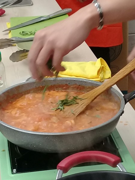 4. 下高湯水入鍋中,海鮮與雞肉熟成後便可將麵疙瘩放入鍋中,加入ㄧ些鮮奶油和帕瑪森起司絲,起鍋前下無鹽奶油, 灑上香菜即可。