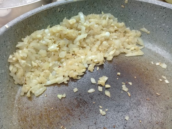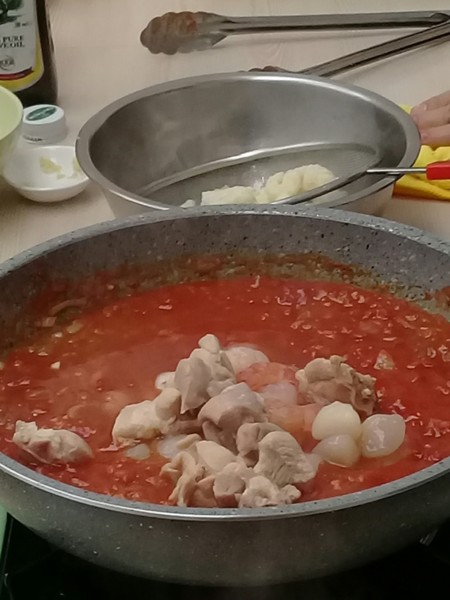 3. 取一平底鍋熱鍋冷油,將洋蔥碎炒至金黃色,加入蒜碎白酒爆香.將處理好的海陸食材下鍋拌炒(雞肉需炒至半熟)後下碎粒番茄放入炒鍋中一起拌炒。