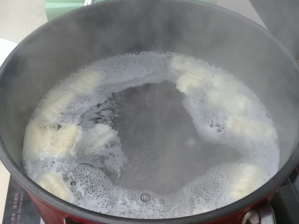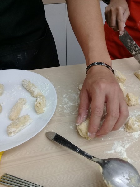 2. 將麵糰沾上少許麵粉揉成條狀,麵糰揉成長條後切成塊狀,切塊後的麵糰用叉子壓扁塑型成麵疙瘩。另起滾水鍋加入3茶匙鹽巴與1大匙油,將麵疙瘩入鍋煮約3~5分鐘,待浮起一分鐘即可起鍋。