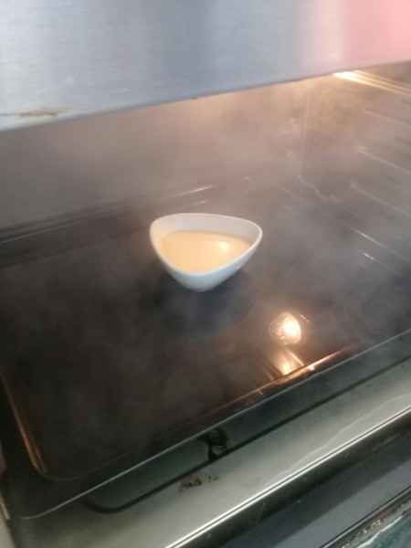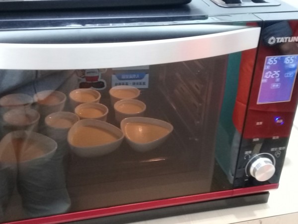 5. 最後烤盤內注入約2公分熱水,隔水加熱 165度c,12分。(請依自家的烤箱溫度及布蕾大小酌情調整) 如果覺得布蕾還有些水水的,可以先將烤箱關掉,再利用餘溫悶熟即可。(剛出爐的布蕾待涼後,記得放入冰箱冰鎮冷藏,之後再來進行加工)