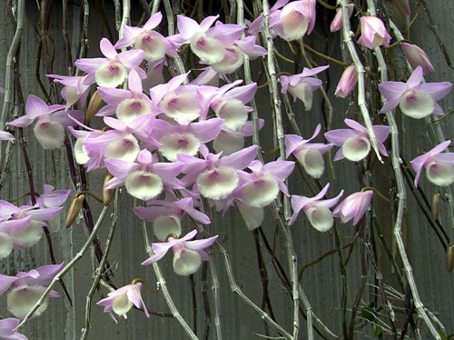 石斛蘭種類繁多,尤其是春石斛被譽為「四大觀賞洋蘭」之一更為可觀。其中粉色的春石斛由於花色素雅,姿態優美使人人喜愛。台灣此款石斛插接繁殖容易,資源豐富。即使掛在低矮的農舍的茅簷下亦能蓬蓽生輝。