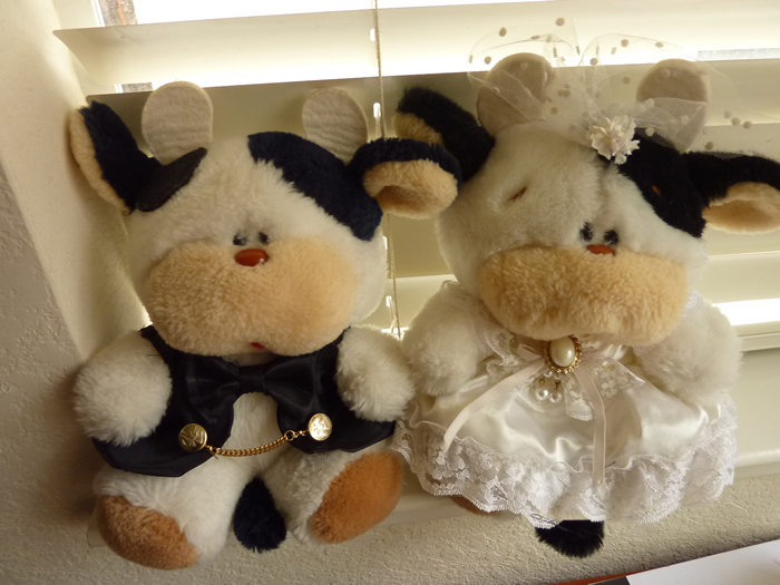 情人節那天老公送了一張卡片,裏面提起我們結婚快二十五年了,也沒想過阿牛及牛妹可以一直陪伴我們這麽多年,覺得很難得,這才注意到阿牛沒有了禮服,所以我非要盡量把它還原才行,沒有想到我們這一代懂得縫紉的人幾乎是零,問過幾個認識的朋友,居然沒有人懂得如何剪裁縫紉,我只好自己試著作,手工自然做得馬馬虎虎,只能遠看,不能近觀就是啦,其實阿牛的衣服本是有衣領及袖子的,如果要剪裁再縫上,未必做得成,做出來也一定是非常難看,以我的功力能把簡單的做出來已不錯了,懂得縫紉的人就一定會覺得的很簡單也可以縫得很漂亮,就像牛妹的衣服就完美無缺,所以將來我還是要找一個會縫紉的人來教教才行,可惜我不見了阿牛的禮服,那個也是上好的料子作的,又沒有照片可以看,所以就只能靠自己能記得的作了,不過,這個過程也蠻好玩的,也算學到一點東西,網路上真的想學什麽都可以學到,不求精湛,只求知識,就是要肯花時間到處遊覽,凡是有心,再難的事也是可以學到做到的。