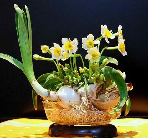 洋蔥般大的鱗莖,兩側各長二個小球莖,略帶微黃的芽葉,羞澀地從莖中探出頭來。那是我從街上買回來的一棵水仙,它安祥地躺在置於案上的瓷盤中,直到有一天……