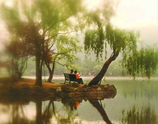 最要命的是那一幅Early Morning,美得讓我想流淚……一潭湖水,成雙人兒,樹影婆娑,處處倒影成景。那一方延伸入湖中的歇地,靠背長椅上坐著的那一對男女,似乎他們走過了大半歲月,在這寧靜的清晨,世間塵囂不復存在了,心境如晨,心靈如水,不起一絲漣漪,大地天際只迴盪著一句話。這樣的美景,襯著雲鶴的一首詩:《一句話》(註2)