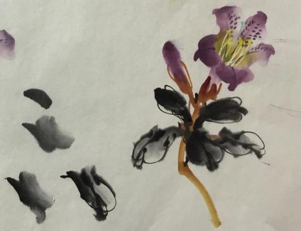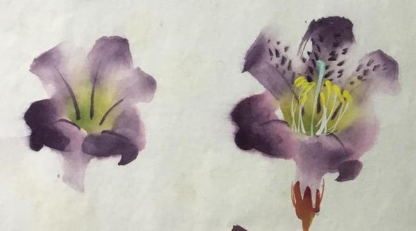 附圖二:狼毫小筆深紫勾葉筋、點瓣斑。草綠染花心。濃粉寫雄蕊須,濃粉黃奌雄蕊。濃粉蘸石綠寫雌蕊。