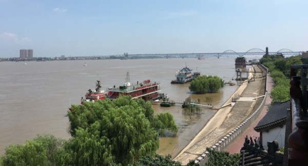 近午時分,驕陽噴薄直射樓古樓,湧進了一股熱氣,但並沒有阻擋不斷湧進懷古的人流。人們有序地參觀,一個個神色凝重。我靜靜佇立廊檐下,觀賞古樓外的美麗江景,並回味白居易《琵琶行》中的詩情畫意。平闊的江面,滔滔江水流逝無痕,跨越江流的長江大橋如蛟龍騰空而起,齊駕彩雲。順著長江大橋望去,雖然隱約可見岸上青青柳色掩映成片林立高樓,展現一派現代化氣息,但古時江畔柳綠掩堤、忽閃忽閃的江風漁火、幾間寂寞的茅房、依依送別友人浪漫而悲愴的場景仿佛仍在我眼前恍動……