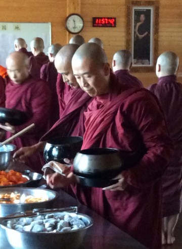 午餐時間到了,我們起身每人領到了一個銅缽、一雙筷子和一把湯勺,這是每一個參修者午餐用的餐具。我們帶著分發的餐具,排好隊,一個接一個下樓到膳堂,打好一份飯後,又打了幾種素菜,靜靜地回到禪堂用餐。我們坐在原位用餐,規矩非常嚴格,吃飯時不能發出聲音,缽裡不能剩下一粒飯,而且飯粒和菜不能掉到地上。用完餐,要靜靜地下樓把銅缽洗干淨放歸原位……