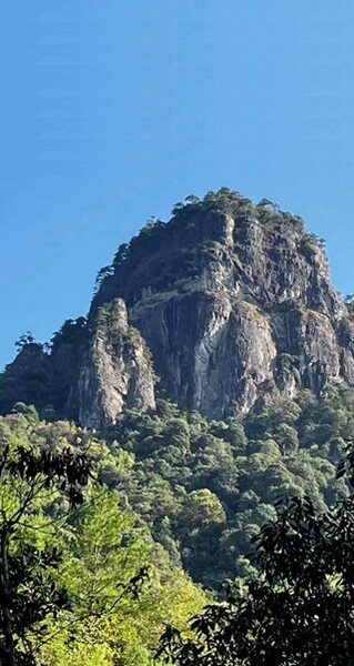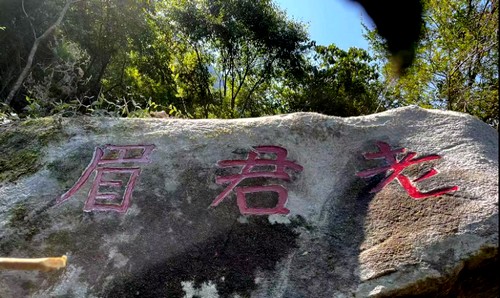 車行了20來分鐘到老君岩峰腳下,高高的老君岩像太上老君一樣,慈善地立在那裡,靜靜地看著人間。我們順著林中小徑,約行了半個小時,走到半山附近。這裡海拔在800米左右,森林密布,竹木蔥郁,溪澗縱橫,岩石兀立,茶葉野生一叢叢在其中,一大片,放眼過去,約莫有數千平方米面積。也有一些老君眉茶灌木或小喬木型茶樹,都是數十上百年的老樅。旁邊大岩石壁上寫著“老君眉”三個大字,這是早年間老雷設立的基地標志。