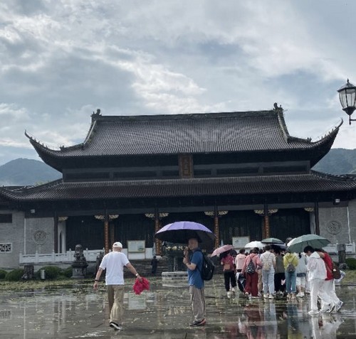 這時天晴開了,淡淡的陽光沐浴着這座綠韻環繞的千年佛剎,其古樸典雅的建築風格,融合了傳統佛教寺廟與江南園林的特色。朝聖團成員靜靜地參觀了寺廟內的雕刻、繪畫及石刻,這些展示古代匠人精湛技藝的作品,使這座環境幽雅的叢林,成為修行者尋求心靈寧靜的理想場所。接着悟參法師又親自陪同朝聖團成員登上後山參觀許多古迹,源源不絕地介紹了古剎的千年傳奇。