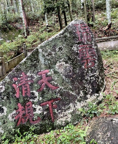 傳說,當時宮中宦官專權,宣宗李忱尚未即位,李忱遭其侄武宗之猜忌,處境險惡,遂決定出外避避災禍。有一天,他遇見一位高僧,談及此事,高僧留下"退至百丈"四個字便走了。於是李忱翻閱地圖,發現江西奉新有座百丈山,他便歷盡千辛萬苦翻山涉水來到百丈山,當他見到眼前的高山聳立,峰巒疊翠,山花爛漫,景色迷人,便揮筆“仙花三月不間色,靈境無時六月寒,更有上方人來到,晨鐘暮鼓碧雲端”的詩句,於是留下來參禪修行,後來他回到朝廷當了皇帝。山石雄奇,傳說迷人。當我們來到一塊刻有“龍蟠石”三個大字的巨石前,悟參法師介紹說,當年“真龍天子”唐宣宗隱於百丈寺為僧時,經常在這塊石頭上打坐禪靜,後人將此石稱為“龍蟠石”。在綠樹和芳草掩映間,一塊刻有“天下清規”的巨石更是讓朝聖者肅然起敬。石刻是唐代大書法家柳公權所書,雖歷經千年風雨長着青苔顯得斑駁,但源源不絕的遊人到此無不虔誠膜拜。因為這塊石刻,正是禪宗文化傳承的重要見證。百丈山,是一座神奇的佛教神山,山上還有許多景點,每一處都有一個美麗的傳說和典故,讓人流連忘返。