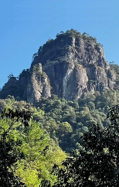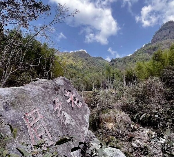 車行了20來分鐘到老君岩峰腳下,高高的老君岩象太上老君一樣,慈善地立在那裡,靜靜地看着人間。我們順着林中小徑,約行了半個小時,走到半山附近。這裡海拔在800米左右,森林密布,竹木蔥鬱,溪澗縱橫,岩石兀立,茶葉野生一叢叢在其中,一大片,放眼過去,約莫有數千平方米面積。也有一些老君眉茶灌木或小喬木型茶樹,都是數十上百年的老樅。旁邊大岩石壁上寫着“老君眉”三個大字,這是早年間老雷設立的基地標誌。