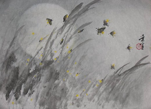 赭墨寫頭、胸,順序側筆寫前翅。硃黃寫腹,腹的尾部用籐黃一圈是為螢光。後翅淡赭墨加黃少許。濃墨寫觸鬚及腳。