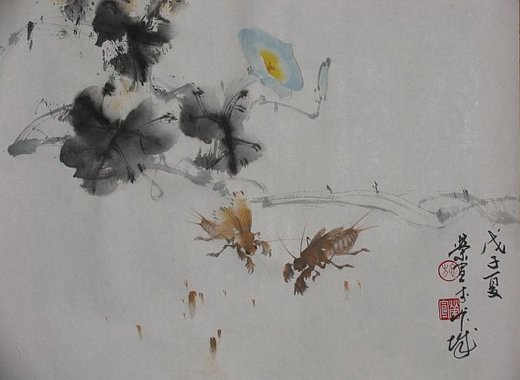 羊毫筆淡赭石醮墨寫頭、胸。順筆側鋒寫翅。草綠醮赭墨紅少許寫腹部,淡墨小筆鹇腹紋,腹節中間上以白粉。小筆濃墨點睛,寫足及稍淡之墨寫觸鬚。