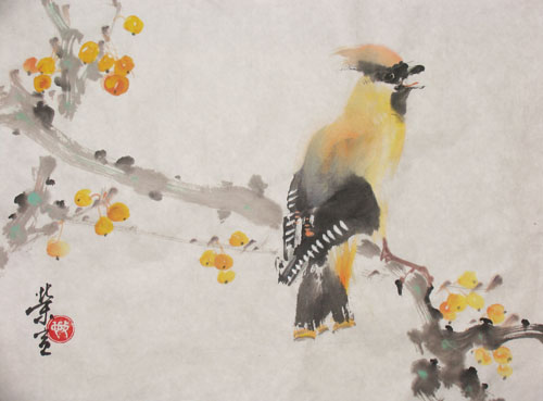繪法:羊毫筆蘸赭墨紅寫背,濃墨寫翅,赭墨寫尾,以硃紅寫尾之先端。由粉點翅上的橫斑。小筆濃墨鉤嘴點睛,赭墨紅寫頭部,赭墨蘸硃黃寫冠羽。濃墨寫過眼紋。淡粉筆尖硃黃寫肚。墨藍染嘴、寫腳。
