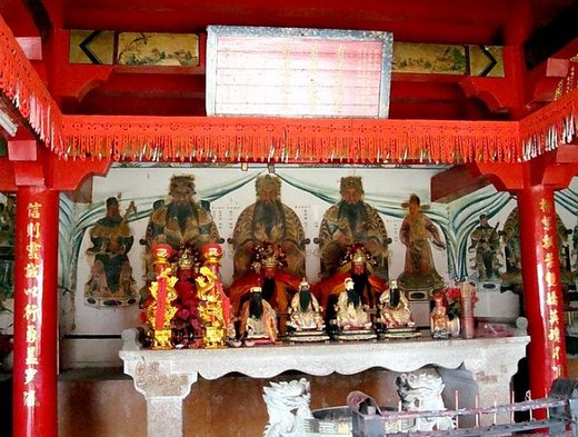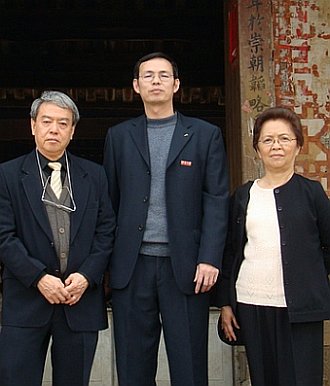 上圖為「三官大帝」的神像,三官大帝即「三皇」,也是:天皇、地皇、人皇三位大帝。五百餘年來,歷久不衰,近年海內外信士前來祭祀者甚眾。下圖:左起:作者雲鶴、許金頂教授、雲鶴太太秋笛在漳浦合影。
